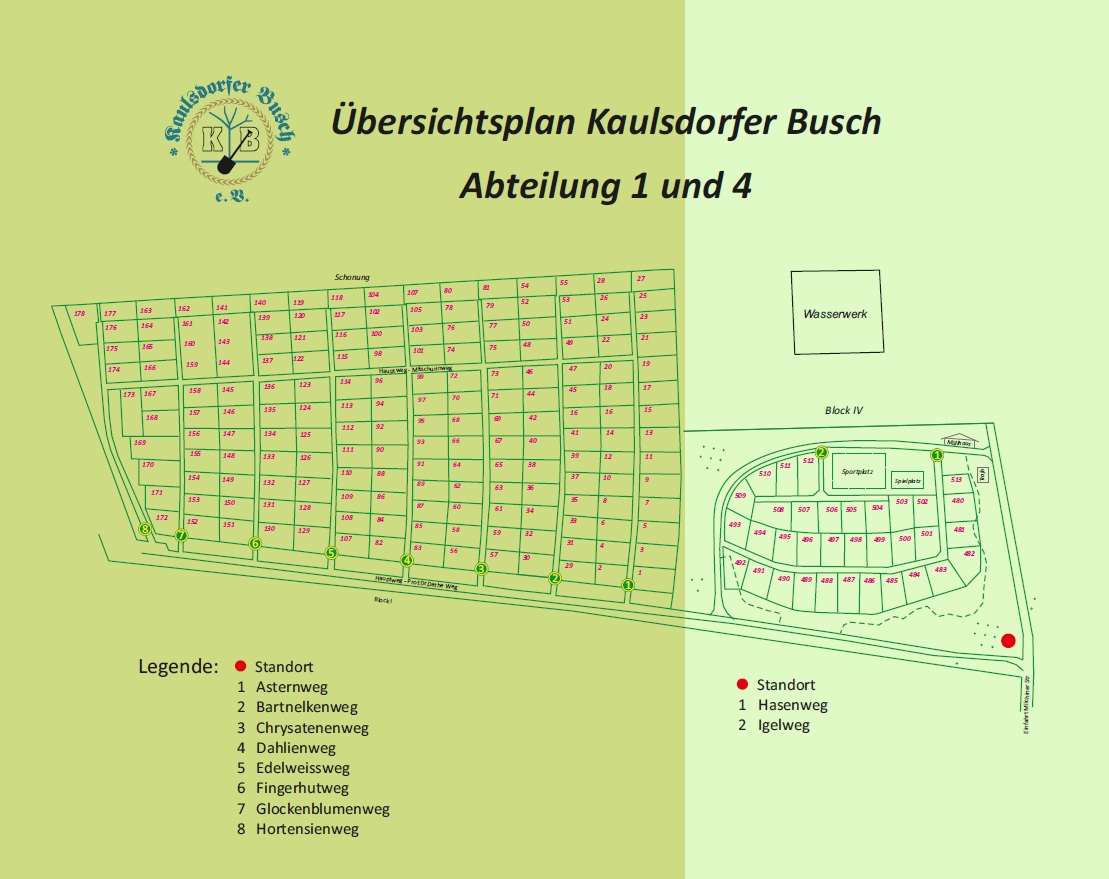 nein sie erhielten einen Namen der zu ihnen passt. Angefangen in der Abteilung I vom Amselweg über den Drosselweg bis hin zum Habichtweg, Abteilung II vom Asternweg über den Dahlienweg bis zum Irisweg, Abteilung III vom Birkenweg über den Eichenweg bis zum Johannisbeerweg, Abteilung IV der Hasen- und der Igelweg.